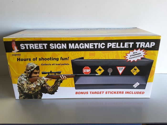 Magnetic Street Sign Trap New stronger construction Hours of shooting fun! Collects all lead pellets Bonus Target stickers included.